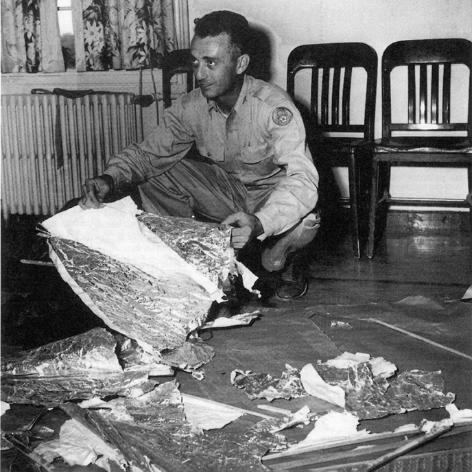 1947年7月4日,美国罗斯威尔发生一场罕见的大雷雨,当晚突然发生不明物体坠毁事件,住在距离罗斯威尔西北方120公里的一个农场主人麦克·布莱索(Mac' Brazel)听到比雷声还大的爆炸巨响。7月5日,他发现许多特殊的金属碎片散布在农场约四百米范围内。7月6日,他带着金属碎片交给罗斯威尔的治安官乔治·维克斯,然后向军方报告,并转交给空军基地。7日,布莱索带着杰西·马西尔(Jesse Marcel)少校和另一个军官到现场检视,并装载一大堆东西带回基地检验。
