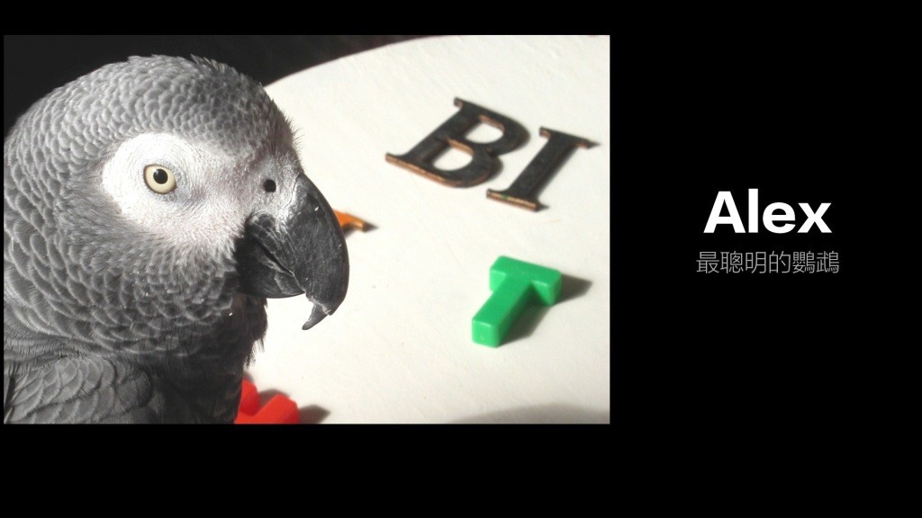 Alex与心理学家相伴30年,它学会了使用英语辞汇分辨50种不同的物体,7种颜色,5种形状,认识150个英语单词,它还能数数,并且理解0这种人类也才刚刚理解了2000年的高级概念,它还会使用“我想要……”和“想去……”等等短语,它能表达情绪,甚至会撒谎,其智力、情感水准和6岁儿童相当。