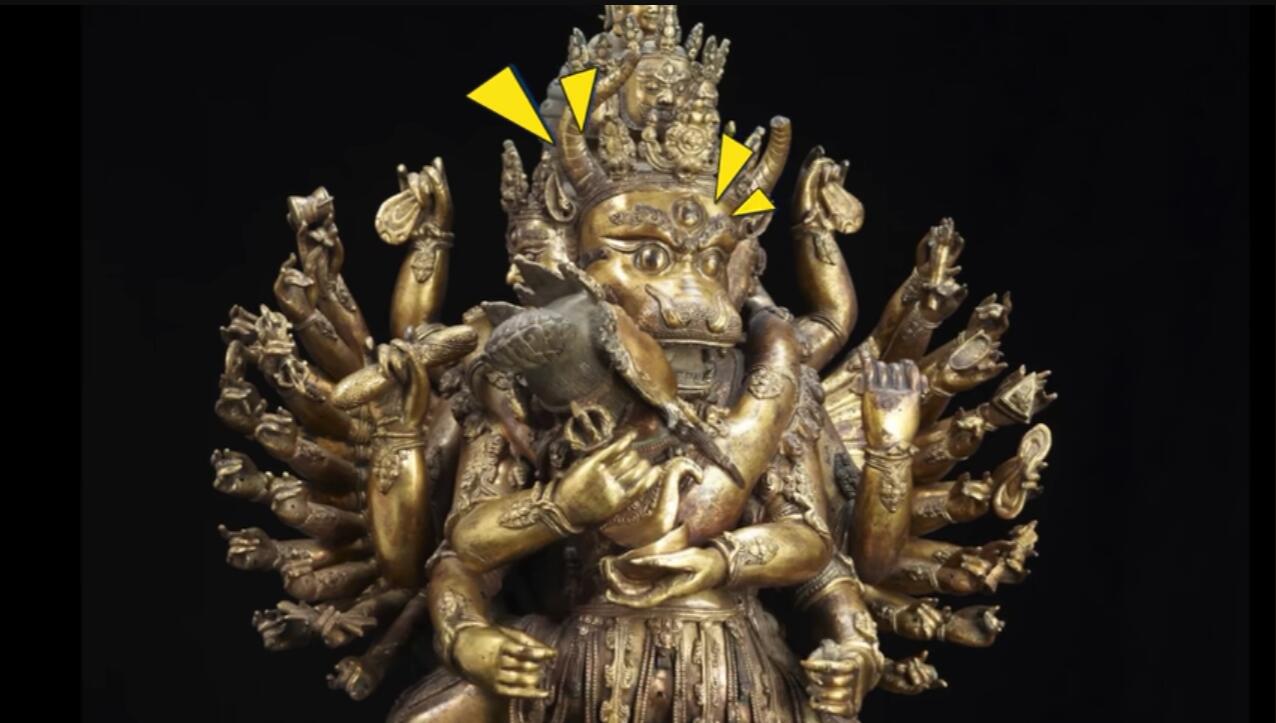 大家看一下大英博物馆收藏的大威德明王的雕像,他就是长着两只角,三只眼的龙族蜥蜴人。这就和圣经启示录13章长着两个脚的兽666对上了: