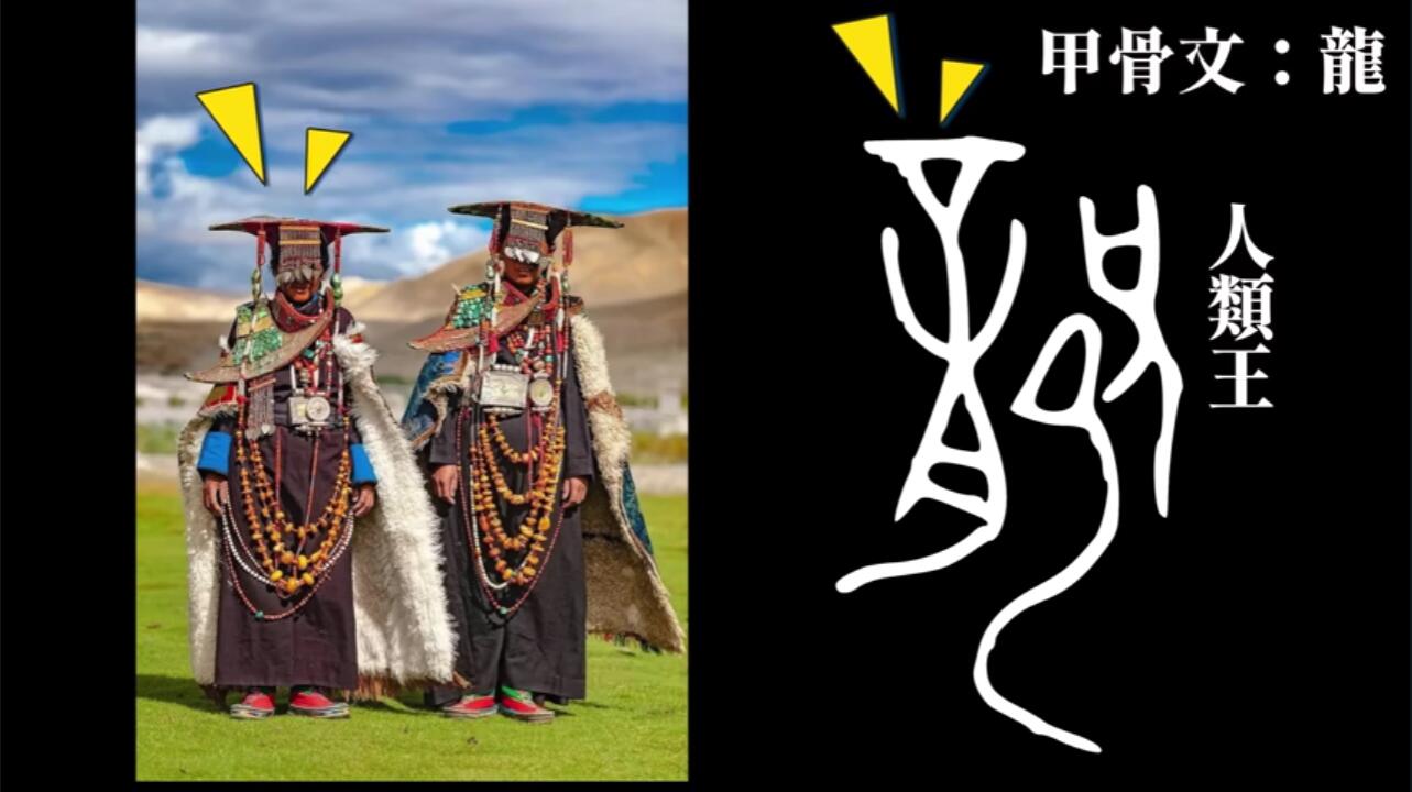 大家看一下龙字的甲骨文,这里他们都带着一个皇冠,左右都有犄角。皇冠的顶部都是平平的样子,这和町玛帽、还有皇帝的冕旒是一样的。所以普兰飞天服,就是龙族女娲的装扮。