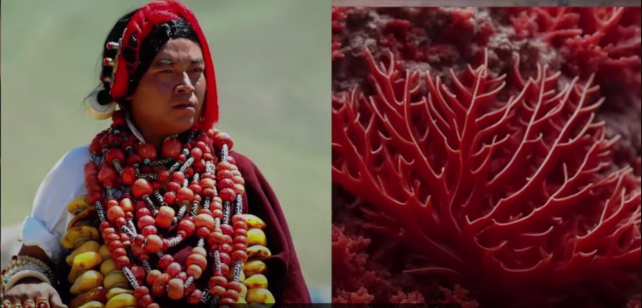 藏族朋友喜欢戴红色的珠宝,这些都是出土于青藏高原的天然宝石级红珊瑚,一克1,500多美元,比金子都贵。
