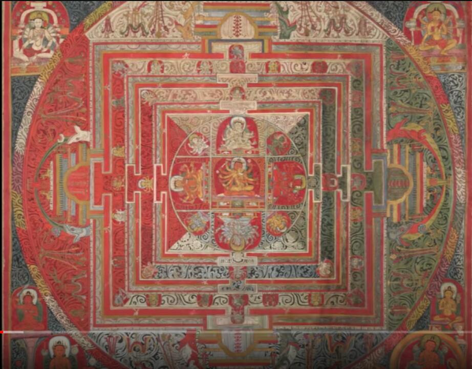 在藏传佛教中,曼陀罗的中间,就是在宇宙的中心冈仁波齐里住着一个神,叫做大威德明王和他的明妃。大威德明王就是三只眼的红色金刚,藏语念作shin je she mar in,意思是死亡的红色敌人;梵语念作Yamāntaka,意思是死亡毁灭者。