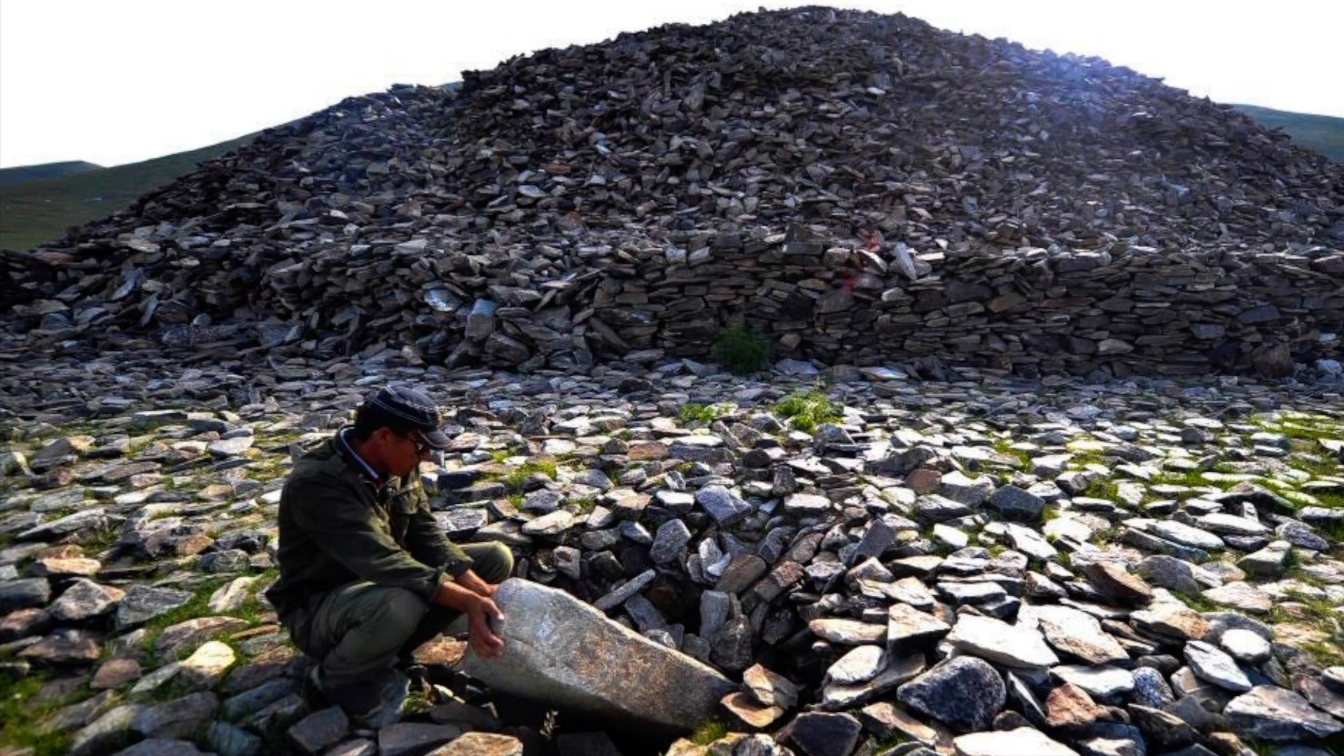 第二天一早,王明哲第一个走出帐篷,他立刻被眼前的景象惊呆了,眼前是一座石头山,明显是人工堆叠的,高约20米,直径约有100米,像极了牧民口中的金字塔。这座金字塔,在一望无际的草原上格外明显,就在不远处,草原上还伫立着草原萨满的圣物——“鹿石”,原来,自己在一座宏伟的草原神殿中睡了一整夜。