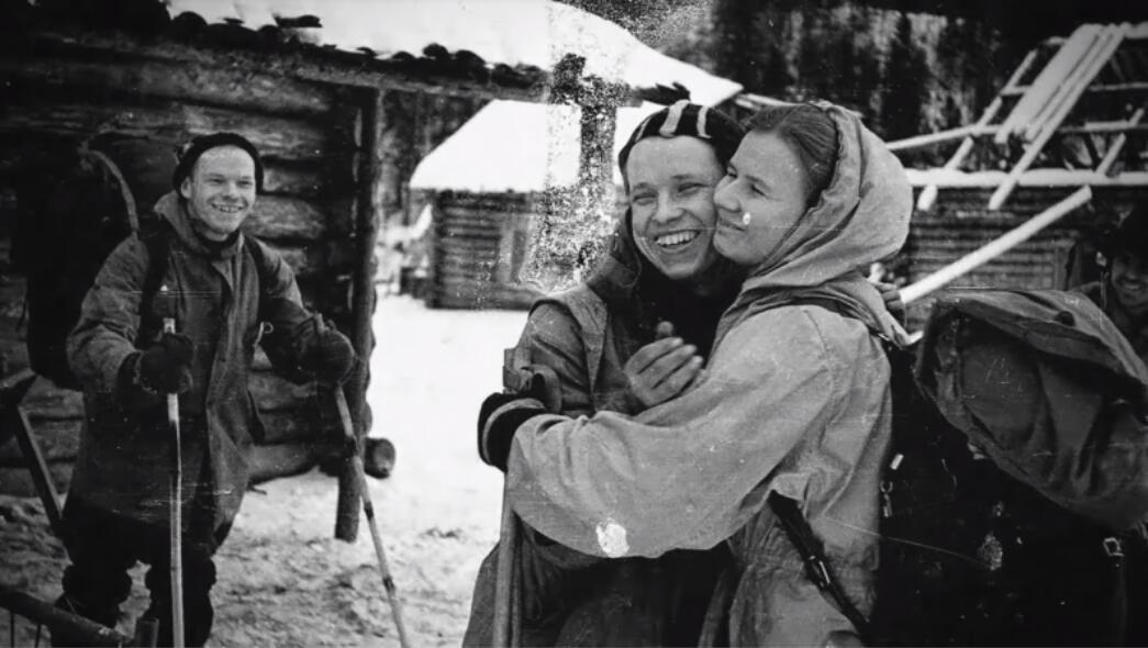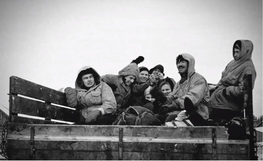 登山队员与因病退出的尤金(中)道别,图左为队长佳特洛夫