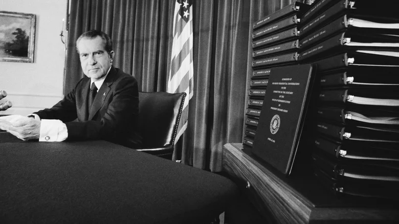 1974 年 8 月 8 日,理查德·尼克松总统通过电视向全国发表辞呈,成为第一位辞职的美国总统。尽管尼克松坚称自己总体上是无辜的,但他的政府却受到水门事件丑闻(该丑闻本身至今仍是个谜)的玷污。水门事件中,一群人(其中一些与尼克松有关)闯入民主党全国委员会总部对室内进行窃听。从 1971 年 2 月开始,尼克松还对自己和来访者的电话进行窃听,录音带录下了椭圆形办公室、行政办公大楼和戴维营尼克松办公室里发生的事情。尼克松对水门事件的反应(包括试图解雇主要反对者)以及调查带来的越来越大的压力最终导致他辞职。