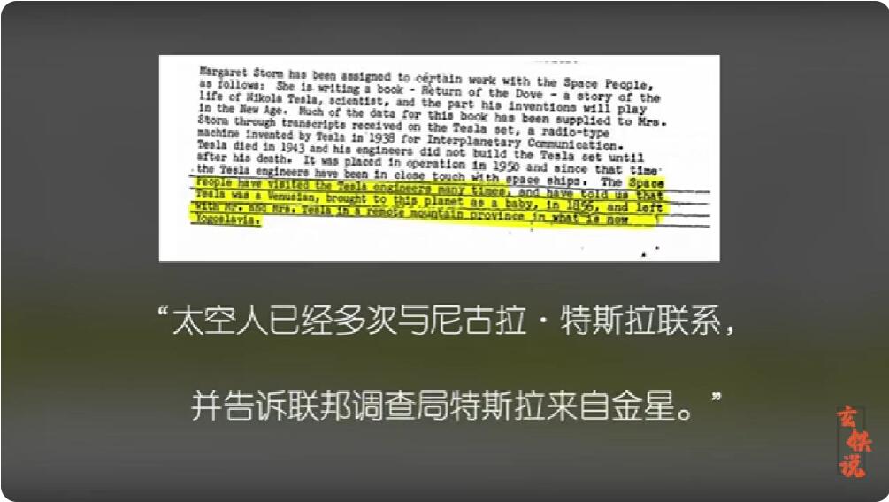 特斯拉在晚年时在自传中提到,他在1901年的时候,曾在实验室里接收到了来自金星的讯号,他认为外星人已经和地球人互动了几个世纪。他还说宇宙存在一个数据库,它保存了所有讯息,他就是从这个数据库里获得知识和灵感的,他说自己只是一个接收器。