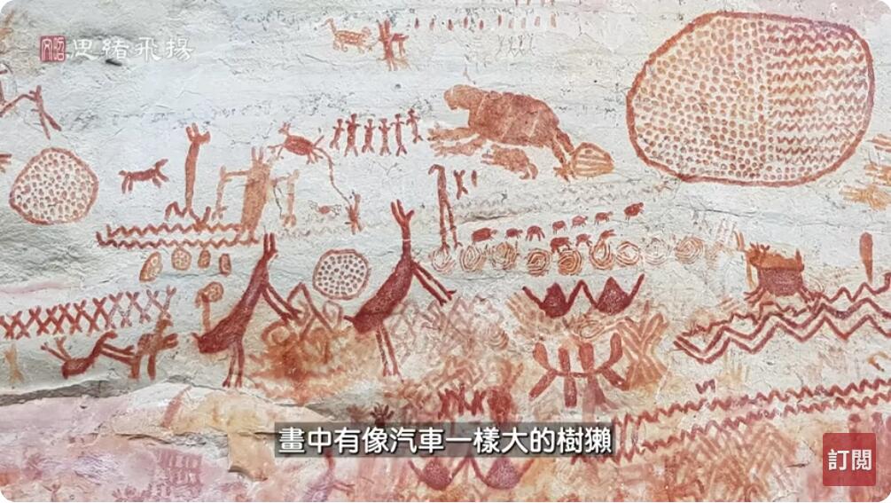 2012年英国和哥伦比亚的一支联合考古队在亚马逊热带雨林当中,发现了一组大型岩画。测龄的结果是:岩画是1万年前的作品。