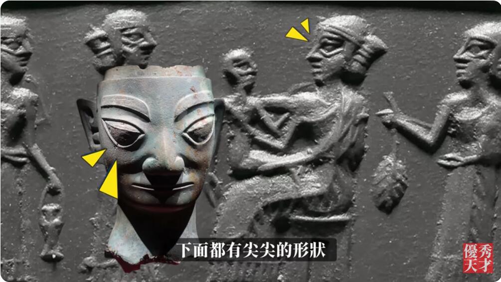 他们的眼睛下面都有尖尖的形状,这和三星堆的眼睛是一样的。