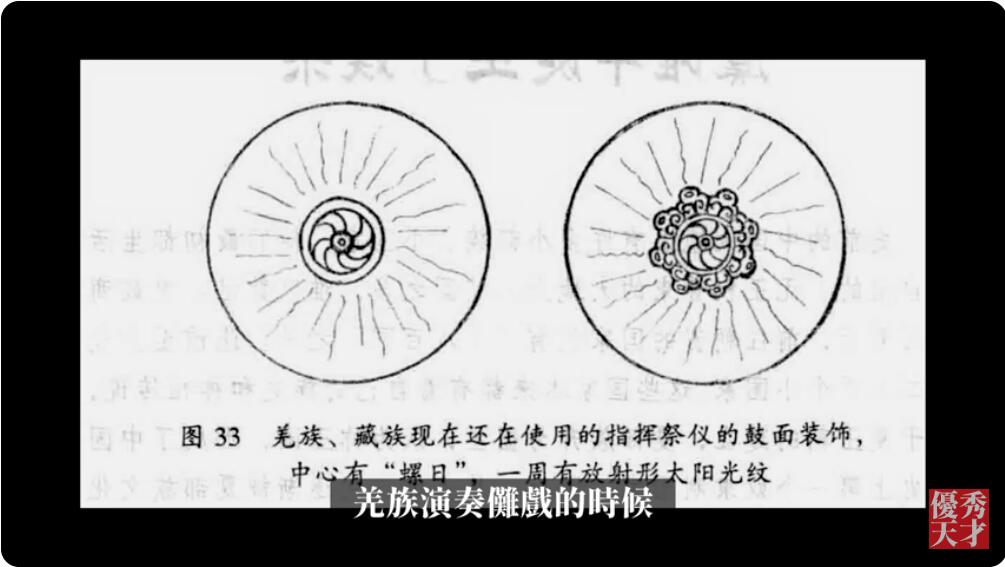 羌族演奏傩戏的时候,敲的鼓鼓面就是太阳神的标志,旋转的漩涡。