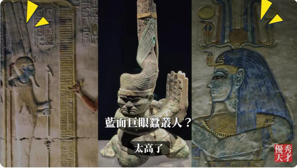 他们的毛发是蓝色的,所以看起来脸也是蓝色的。蓝色的神在古埃及也出现过,叫做太阳神阿蒙。大家看一下,蓝色的阿蒙神,还有他的锥髻。
