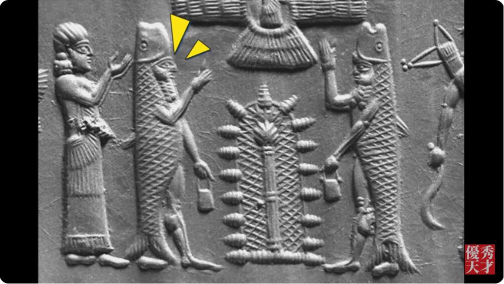 我给大家看一下上古苏美尔石板,里面有个鱼形的神。