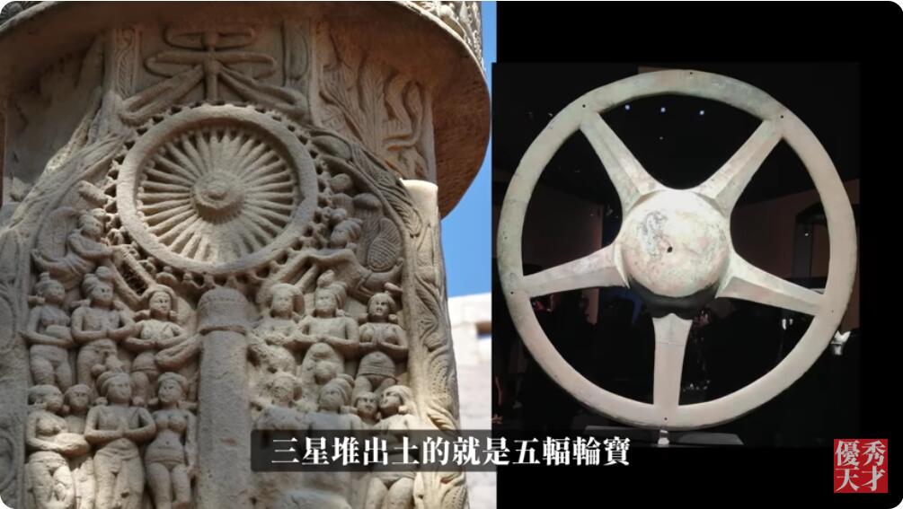 轮宝根据它中间的这个车辐有很多种,三星堆出土的就是五辐轮宝,太阳的标志。轮宝在天上出现的时候,地上就会出现转轮圣王。