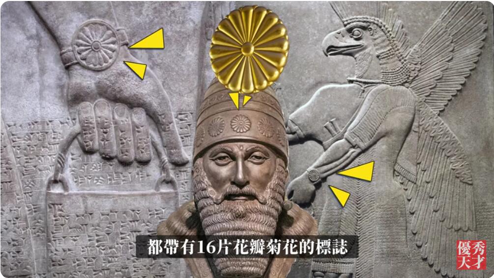 阿努纳奇时刻的手腕和权杖上,亚述国王的皇冠上都带有 16 片花瓣,菊花的标志。