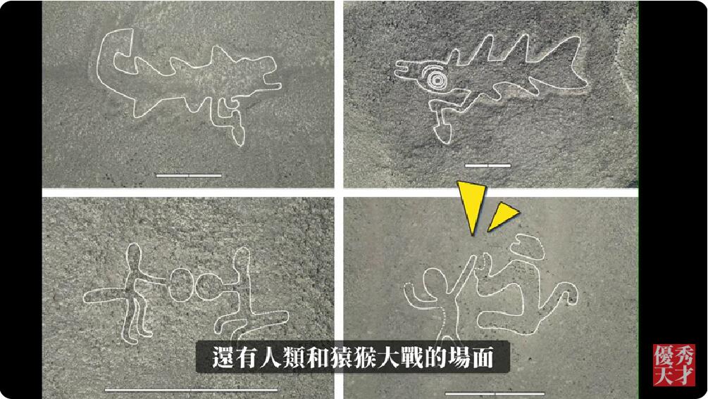 大家看这些新发现的线条,他们有的头上有发光,和长了很多腿的外星人,也有手里拿着铲子的大鱼,还有人类和猿猴大战的场面。