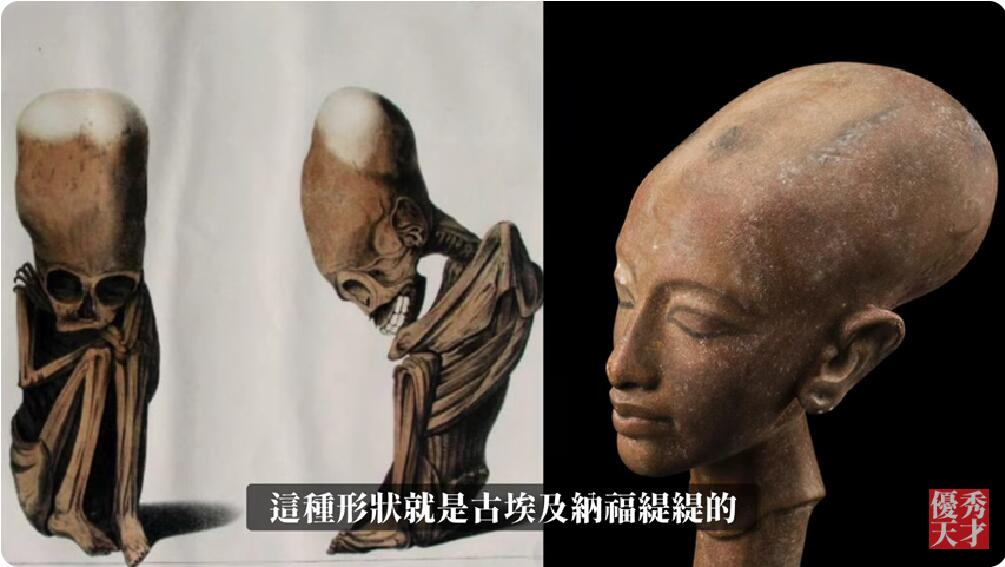 这种形状就是古埃及那芙提提女儿的头骨的形状,这就证明这些长头头骨有一段现代人类没有的DNA,他们是从小就长成这样的。