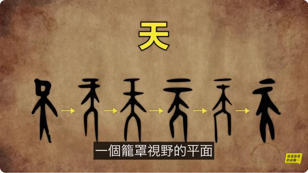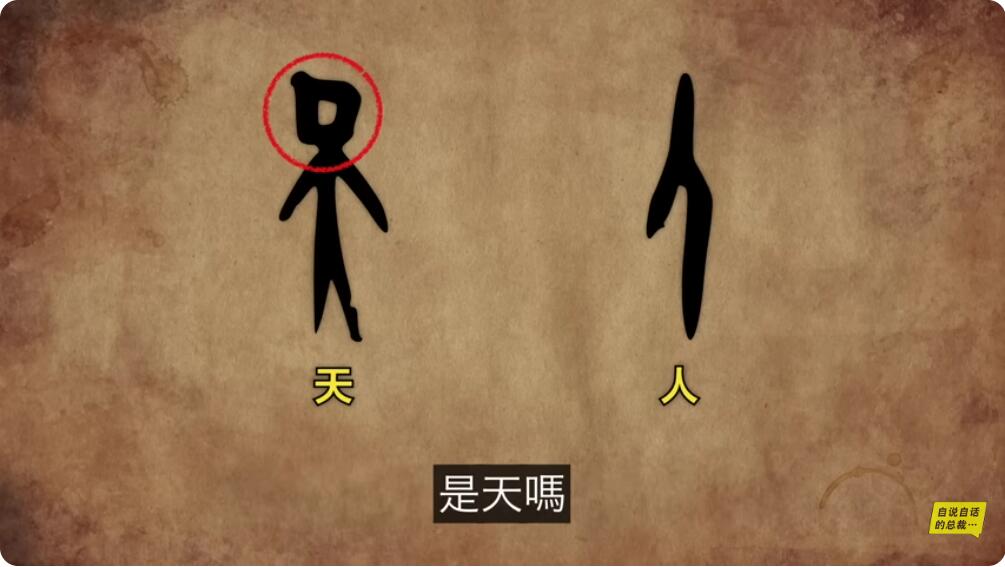 有一位名叫李卫东的甲骨文学者曾经这样解释,他说,我们继续看,往后的甲骨文,还有一些天的写法,和今天写法一致,是人头上有一个平面的天。