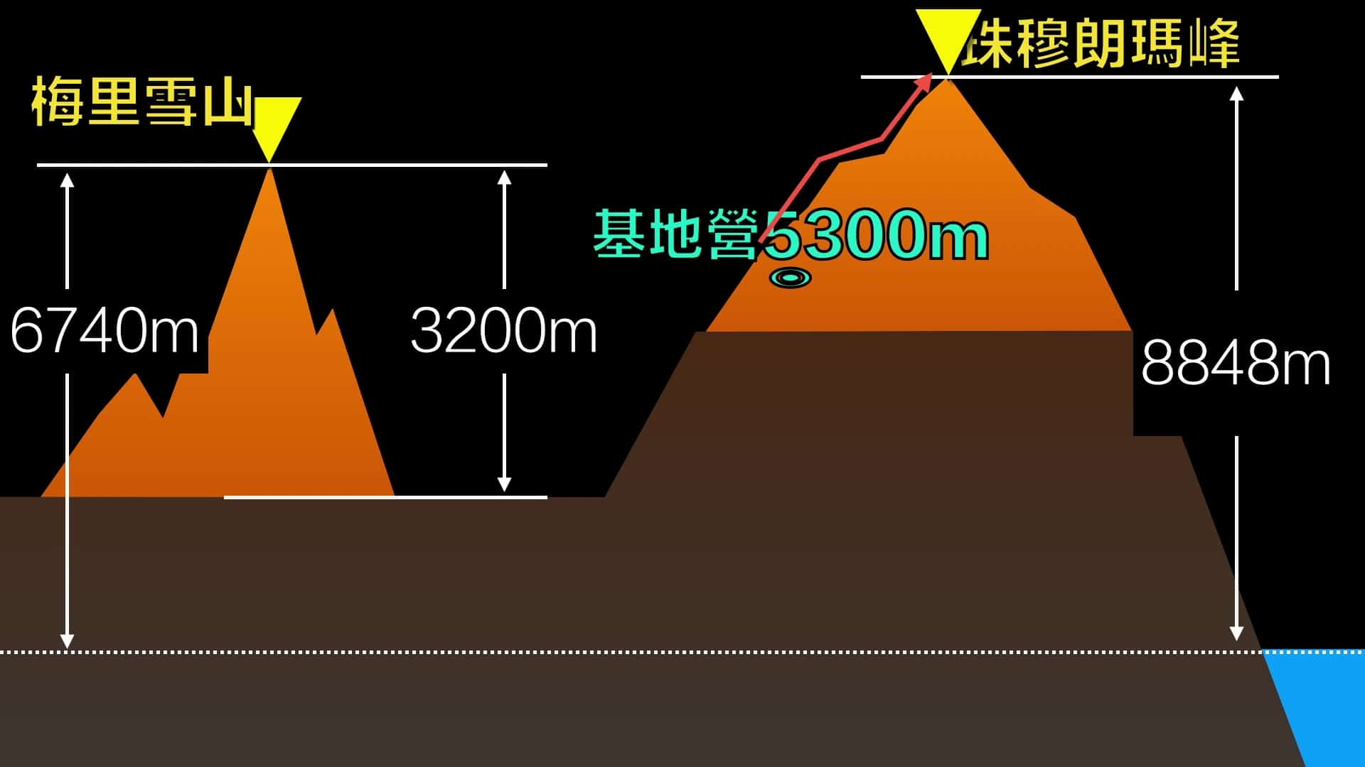 狂泻3200多米,而登顶,就恰恰要从这个冰斗上攀登上去……后来证实,这也就是梅里雪山极难攀登的原因之一。他的垂直落差很大,有3200多米。而世界最高峰——珠穆拉玛,虽然有8848米,但基地营就有5300米,又是一条相对缓坡的雪路通往顶峰,所以攀登难度并不算太高。