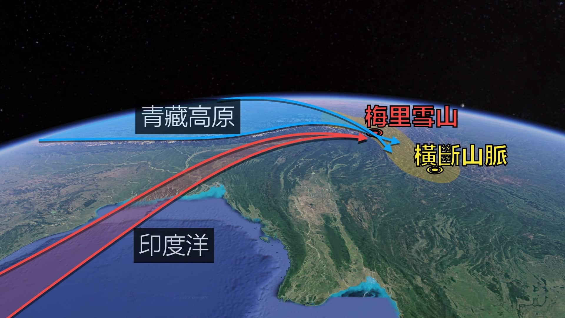 梅里雪山还有一个问题。那就是,它是整个横断山脉上,非常靠近印度洋的一座主峰。横断山就像一个拔地而起的屏风,青藏高原和西伯利亚的冷空气都撞在这上面,还有印度洋的暖流也会直接撞过来。
