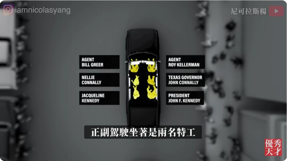 肯尼迪和第一夫人杰奎琳坐在车的最后一排,肯尼迪坐在右边,他的妻子坐在左边;坐在肯尼迪前面的是德克萨斯州州长约翰·康诺利和州长的妻子;驾驶座和副驾驶座上坐着两名特工。