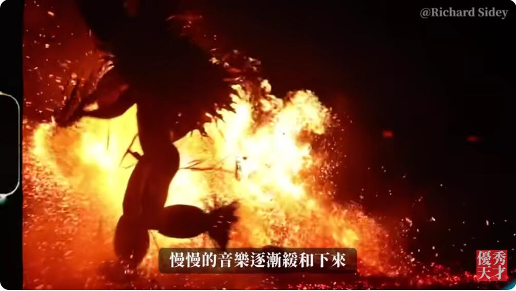 这时候有人向广场中央的火堆加了一大把柴火,火焰突然冒出,窜到最高处,这时吟唱和击鼓声突然再次响起,节奏非常紧迫,好像危险将到临。