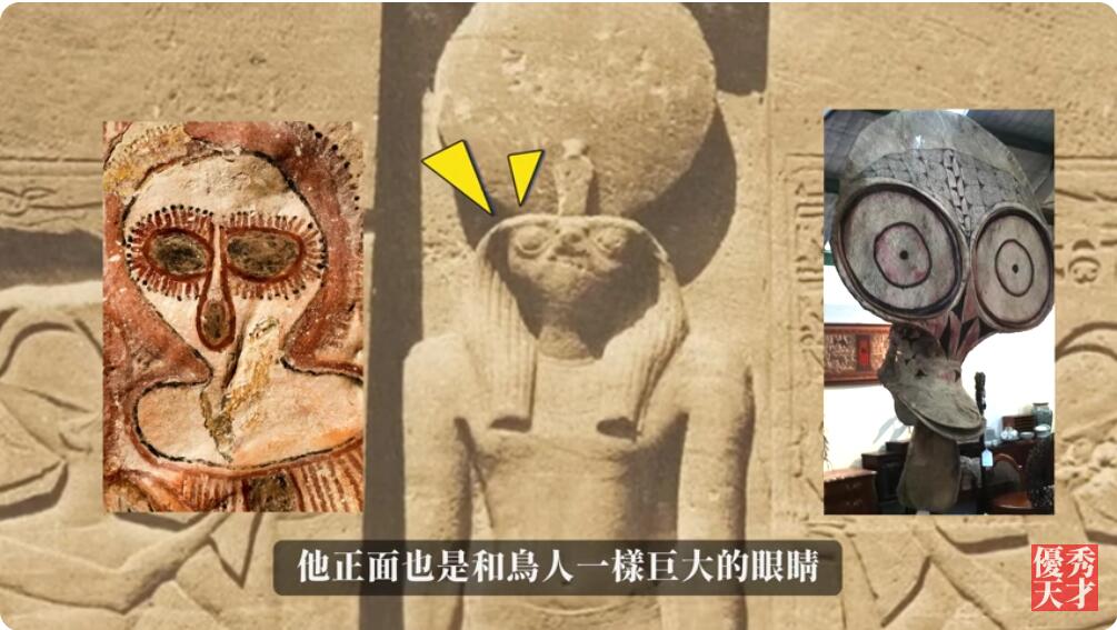 我们再把这个形象带到古埃及去对比,那它就变成了太阳神荷鲁斯。他正面也是和鸟人一样巨大的眼睛。
