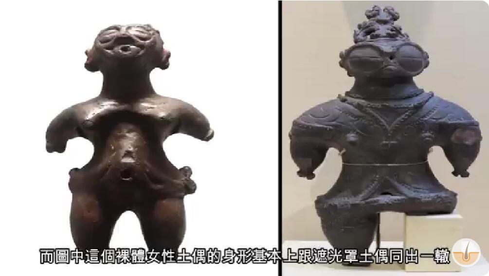 在画面中这几个不同时期土偶都可以找到相似的共通点,而图中这个裸体女性土偶的身形基本上跟遮光罩土偶同出一辙,就连眼睛造型也不例外。
