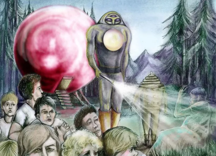 一大群人迅速聚集起来。突然,飞船上的舱门打开了,两个生物走了出来。一个是矮小的机器人,另一个是巨大的人形生物(12 到 14 英尺高),在镇上走来走去,也许是在观光。外星人似乎有“三只眼睛”,穿着银色连体衣,青铜色的靴子,胸前有一个圆盘。