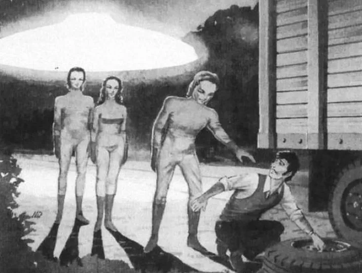 被催眠的男子讲述了三个外星人如何接近卡车,并用类似剃刀的装置从他的食指上剥下一小部分皮肤。之后,他被一束黄色光束笼罩,并被吸进飞船。