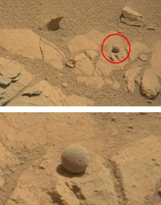 这个球体呈完美的球形,是好奇号探测器于 2014 年末在第 746 个太阳日的一块岩石露头上发现的。