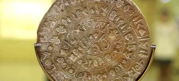 古代费斯托斯圆盘的两面都刻有无法解读的符号。目前陈列在克里特岛的伊拉克利翁博物馆。