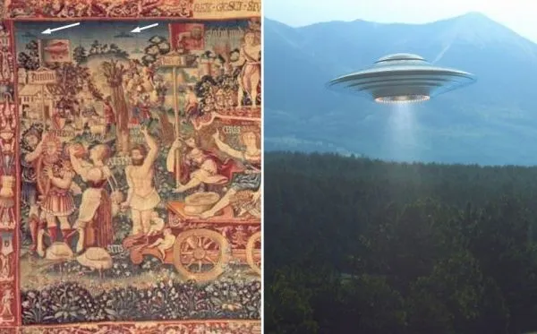 它描绘了统治者胜利登基的场景。然而,这幅挂毯描绘的是一个更有趣、如果不仔细观察就很容易错过的东西——天空中无数的物体,具有经典的 UFO 形状。