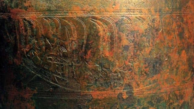 在一个大酒桶上,专家们发现了羽人划龙舟的刻画。