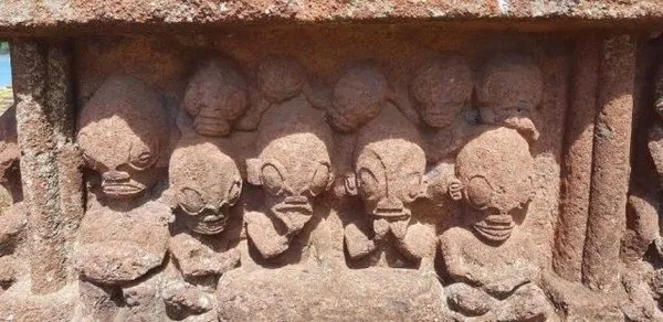在极少数情况下,奇特的实体不是被雕刻成独立的提基雕像,而是被雕刻成墙壁上的浅浮雕。下图描绘了一群头部巨大的神秘生物,戴着头盔或头饰。