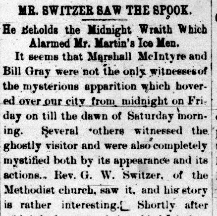 它看起来有二十英尺长,八英尺宽,长着几对鳍,飞过一所房子,然后消失在东方。当它回来时,人们惊恐地逃走了。卫理公会牧师 GW Switzer 和他的妻子也看到了这个神秘生物。