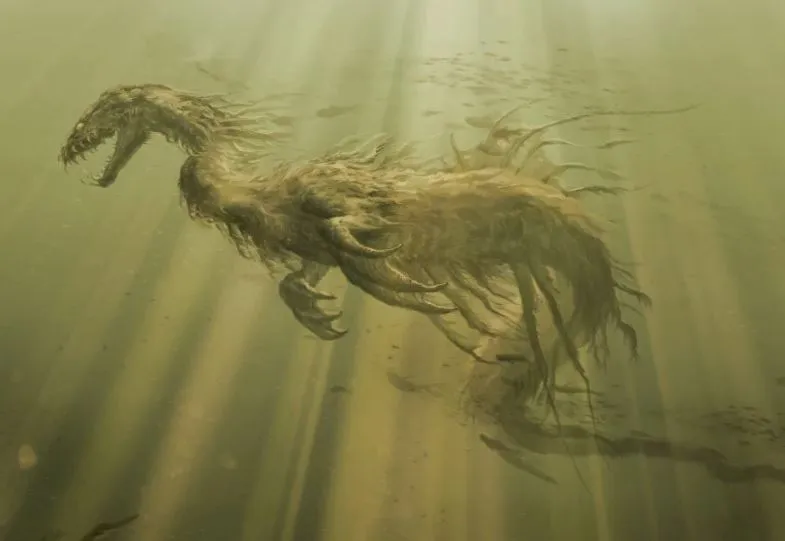 下一刻,我看到一个大东西从水里冒出来,看上去就像干草堆浮出水面。我看着它,发现那只生物身上覆盖着一层类似海豹的深棕色羊毛状皮肤。它发出嘶嘶声,又潜入水中。”