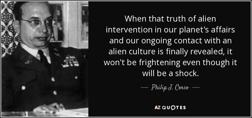 菲利普·詹姆斯·科索是一名美国陆军军官。1997 年,他出版了《罗斯威尔事件后的第二天》一书,讲述了他涉嫌参与研究 1947 年罗斯威尔事件中回收的外星技术。来源:AZ Quotes