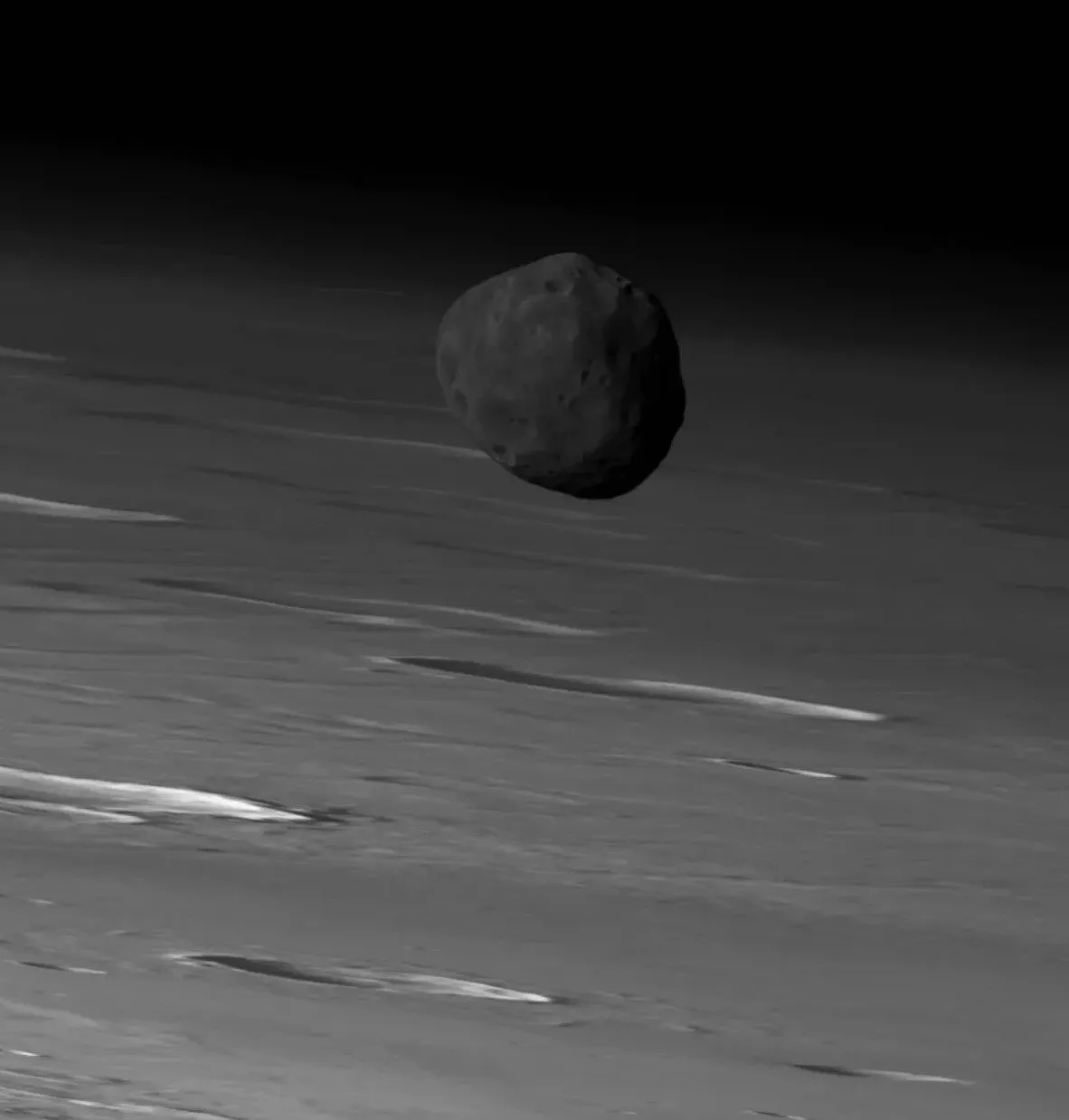 2010 年 3 月 26 日,欧空局火星快车号航天器上的高分辨率立体相机拍摄了火卫一绕火星运行的图像。