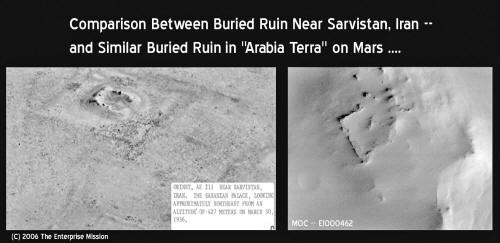 许多人认为,火星全球探测器拍摄的图像是这颗红色星球表面另一个明显的被沙子覆盖的人造废墟,其坐标如下: 位于北纬 28.38°,西经 332.54°,位于一个被恰当地称为“阿拉伯地”的地区。