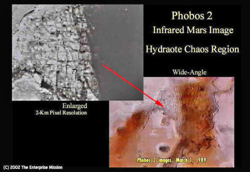 然而,得益于苏联拍摄的火星照片,更多结构得以辨认。其中最精彩的例子是苏联探测器“火卫二”号拍摄的,它在绕火星轨道运行仅90天后就“神秘地”失踪,之前曾发回多张奇特的图像。
