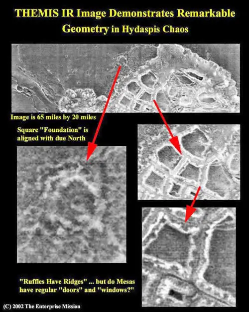 2002年,美国宇航局的火星奥德赛号探测器首次拍摄到这颗红色星球的夜间红外“测试”图像,揭示了许多人称之为“埋藏的火星城市”的景象。奥德赛号探测器传回的数据似乎揭示了火星表面另一组令人难以置信的几何结构,该区域位于苏联火卫二号图像的旁边 ——“希达斯普西斯混沌”(北纬2°/西经29°)。