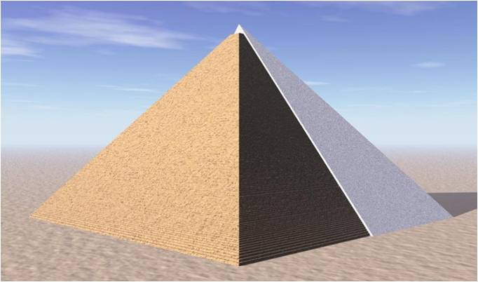金字塔巨大的尺寸使其结构在很远的地方都能被看到。事实上,在众多地球卫星图像中都能轻易地观测到大金字塔。然而,其巨大的尺寸并不是金字塔能够从很远的地方被看到的唯一重要因素。吉萨大金字塔最初被抛光石灰岩包裹的石块覆盖。古埃及人称大金字塔为“Ikhet”,意思是“辉煌的光芒”。据说这些包裹的石块反射了太阳光,使金字塔像一面巨大的镜子一样闪闪发光。这些包裹的石块现在已不复存在,因为在 14 世纪的一场地震中,许多石块松动,阿拉伯人用它们来建造清真寺。据计算,最初的金字塔及其包裹的石块就像巨大的镜子,反射的光线非常强烈,从月球上看,它就像地球上一颗闪亮的星星。