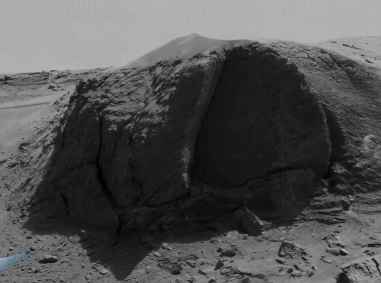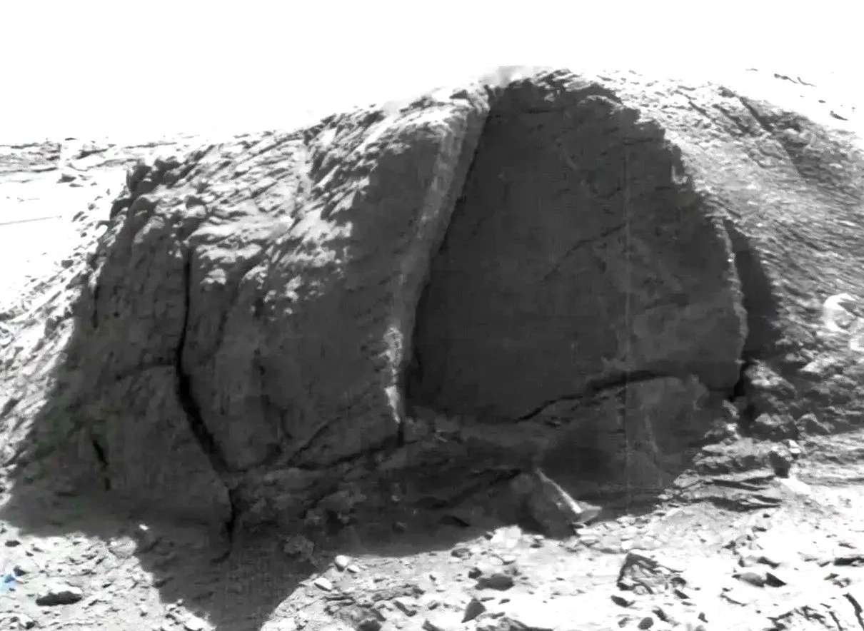 该物体光滑的半圆形轮廓与周围粗糙的天然岩层形成鲜明对比。其表面呈现出非自然的抛光效果,与火星典型的侵蚀地质特征截然不同。