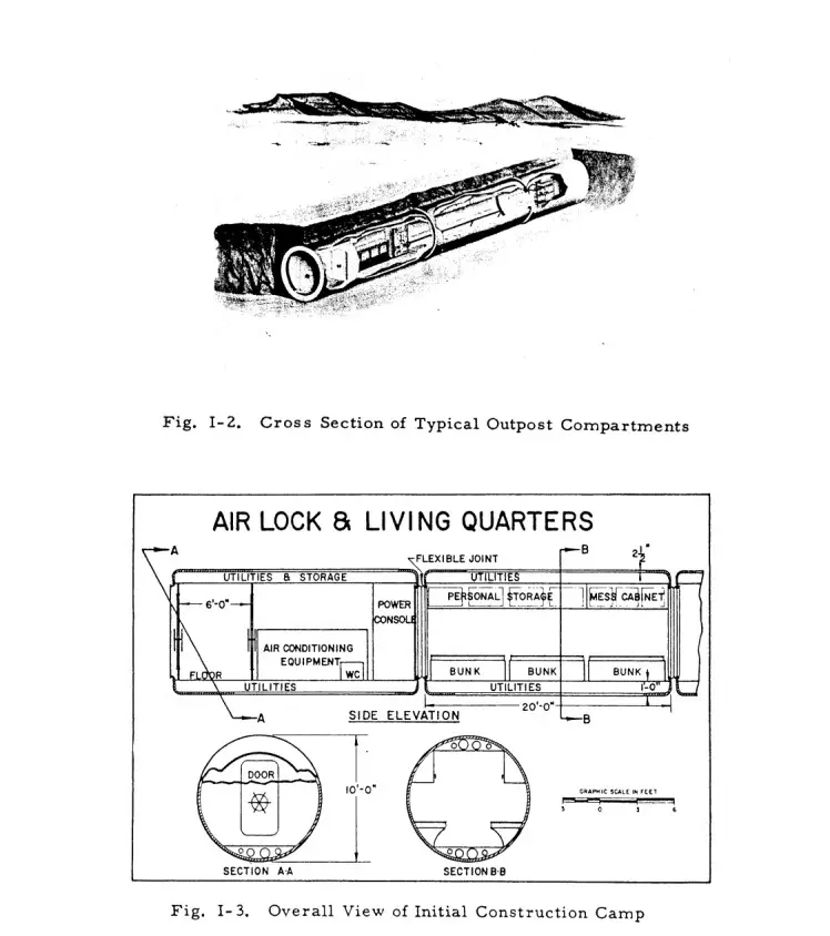 在规划过程中,研究人员考虑到前哨站的设计需要兼顾扩建设施、人员补给和运营,以最大程度地延长其持续使用时间。这项1959年的未来主义项目旨在尽可能长时间地实现自给自足,无需地球提供任何额外支持。