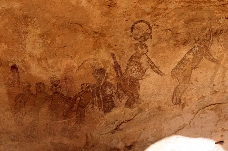 这些洞穴壁画的年代据信约为1万至1.5万年。在众多已发现的岩画中,古人类描绘了长颈鹿、鸵鸟、大象、牛、鳄鱼甚至河马的形象,表明撒哈拉地区在遥远的过去曾充满生机。然而,最令人难以置信的是那些戴着头盔、穿着宇航服的奇异生物的神秘描绘,据一些研究人员称,这些生物与现代宇航员很相似。