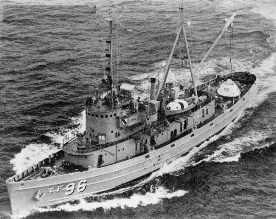 1971年1月12日,美国海军阿布纳基号驱逐舰(ATF-96)在回收一艘宇宙飞船后航行。图中显示的是一艘模拟的阿波罗太空舱。图片来源:公共领域