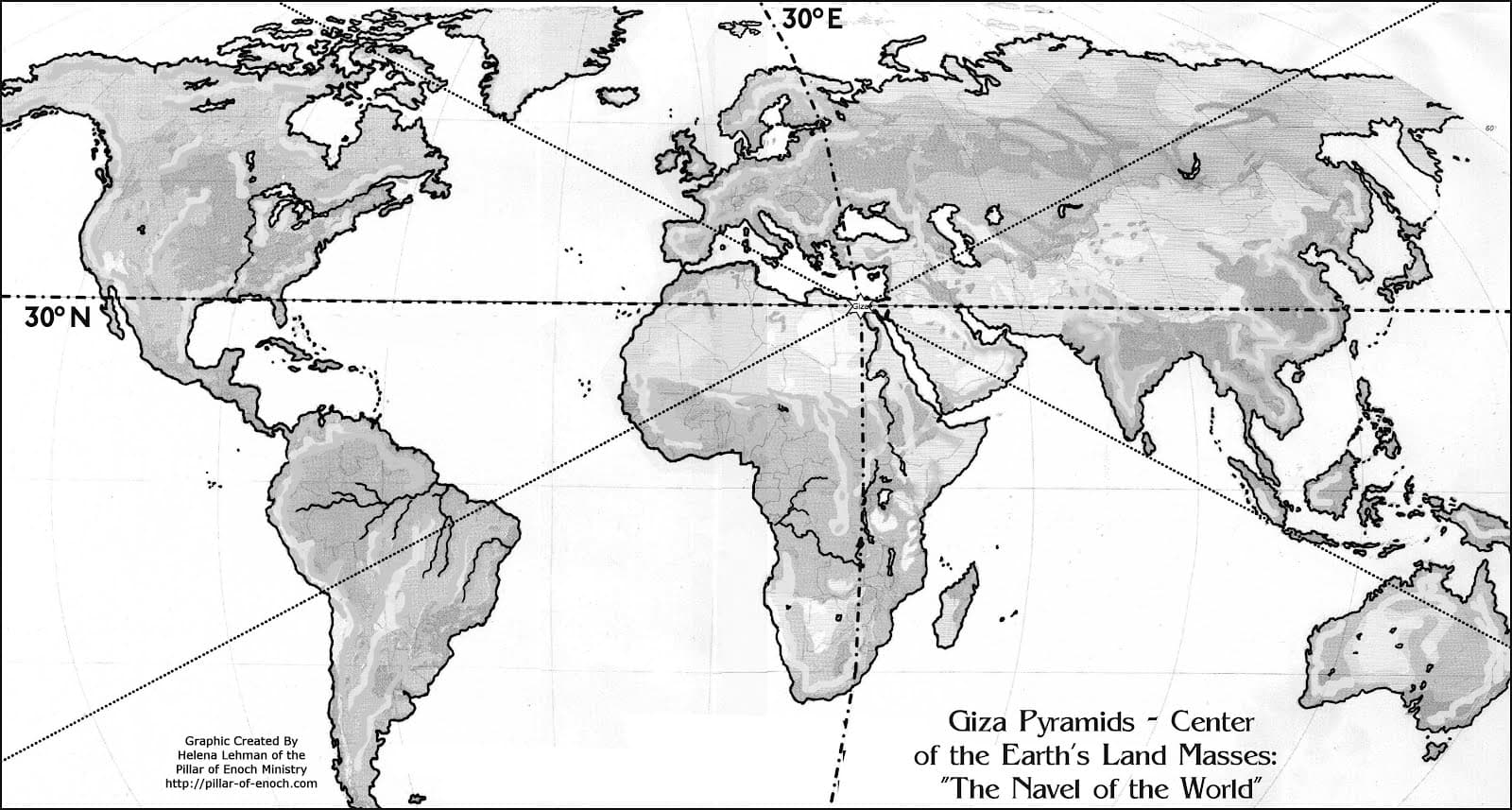 有趣的是,1877 年,作家兼神学家约瑟夫·塞斯 (Joseph Seiss) 证明,吉萨大金字塔位于最长纬线和最长经线的交汇处,即 世界所有陆地的正中心。