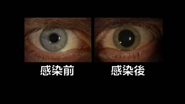 但就在10周以后,他突然觉得左眼视线有点模糊,眼球开始充血,而且他原本蓝色的虹膜,也变成了绿色。