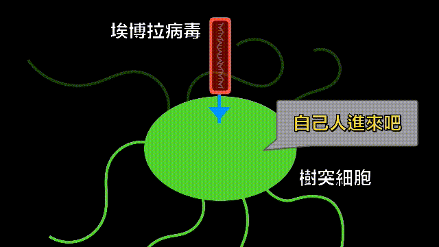 也就是说,埃博拉把照片拿出来给树突细胞看的时候,树突细胞会认为,这是自己人,和它握手,然后把它送入到自己的身体里面……