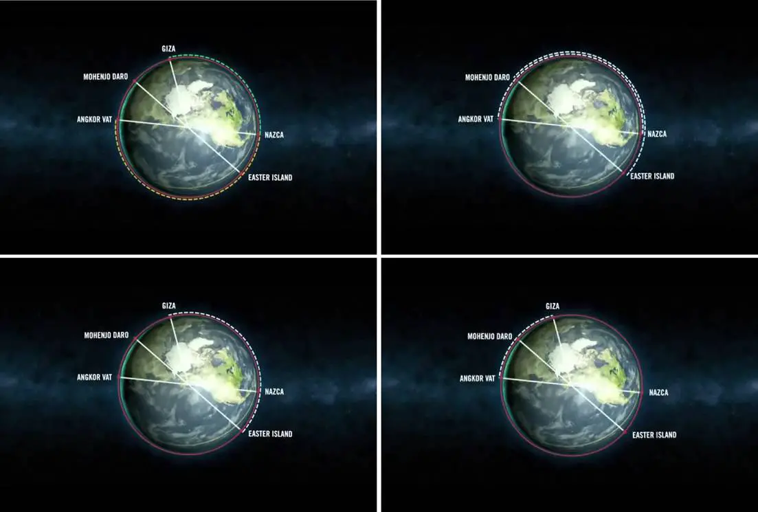 就好像世界各地的古代文化都根据先进的几何图案,精确地在世界各地安置重要的纪念碑、城市和礼仪中心一样——当绘制在地图上时,这些图案显示几乎所有古代遗址都是相连的。