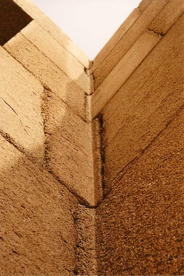 寺庙的石灰岩墙壁长 45 米,厚度呈指数减小,使其外观看起来像一座马斯塔巴。